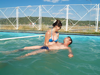 Nici nu intram bine, si ne potolim setea c-o bere, c-un suc… si sarim din tzoale. Mergem cu Denisa mai intai in piscina mica, ca sa o balaceasca si pe Bebelina, dupa care ne mutam in bazinul mare. Exact, vreau sa sar la trambulina… :D